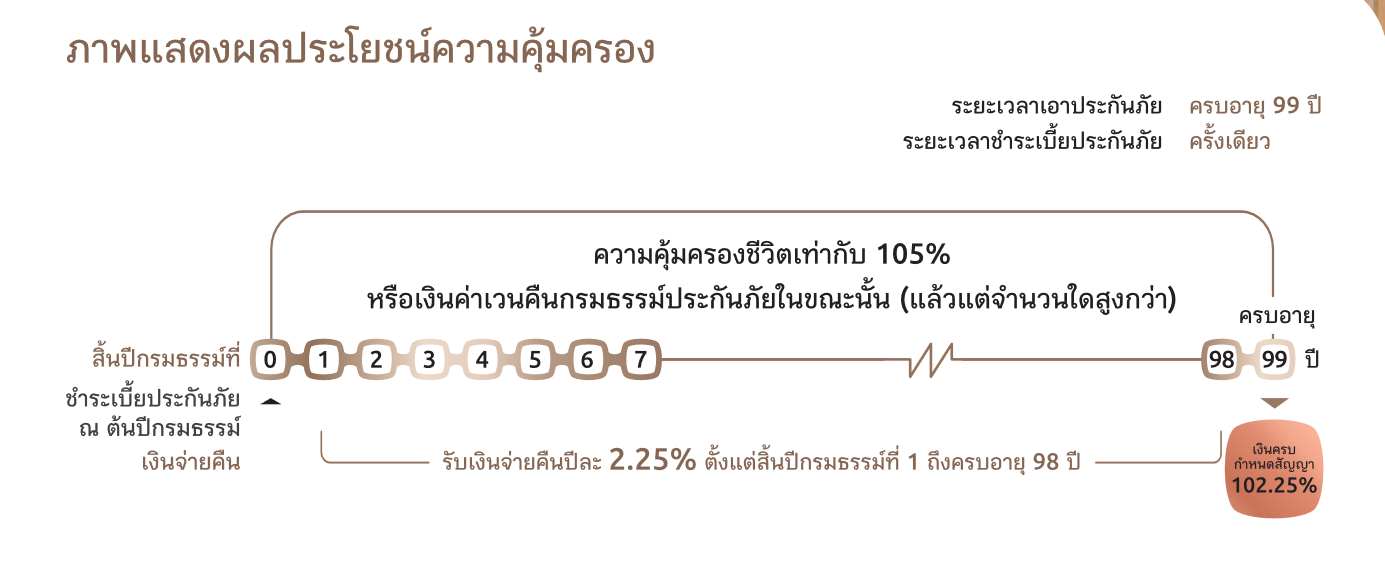 A7: มีเงินคืนทุกปี 2.25% ของจำนวนเงินเอาประกันภัย ไปจนถึงอายุ 99 ปี.