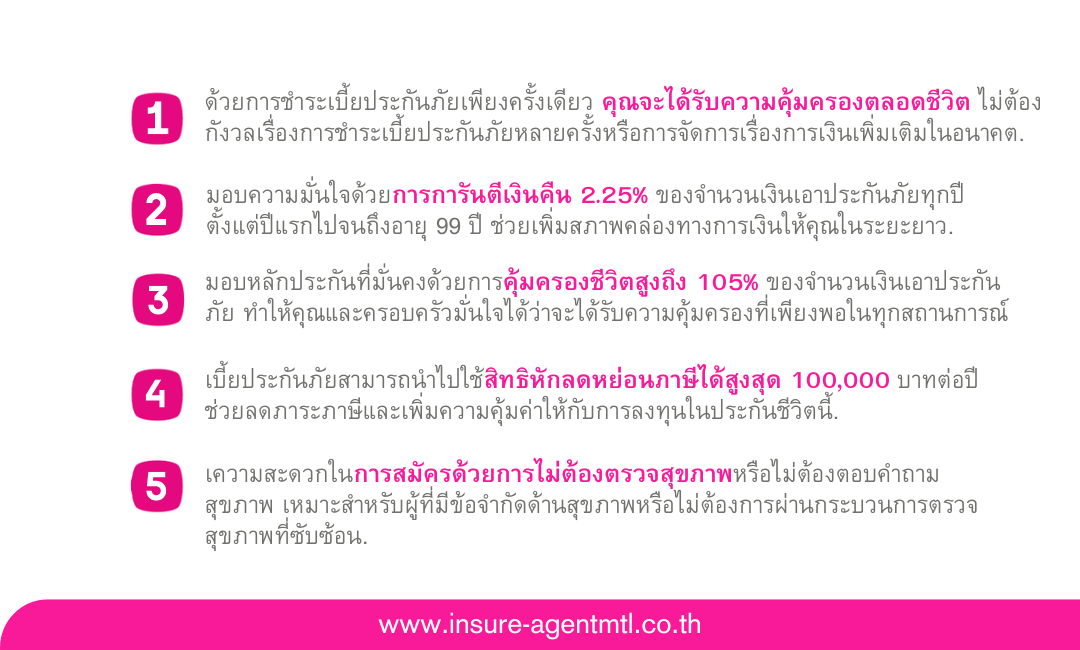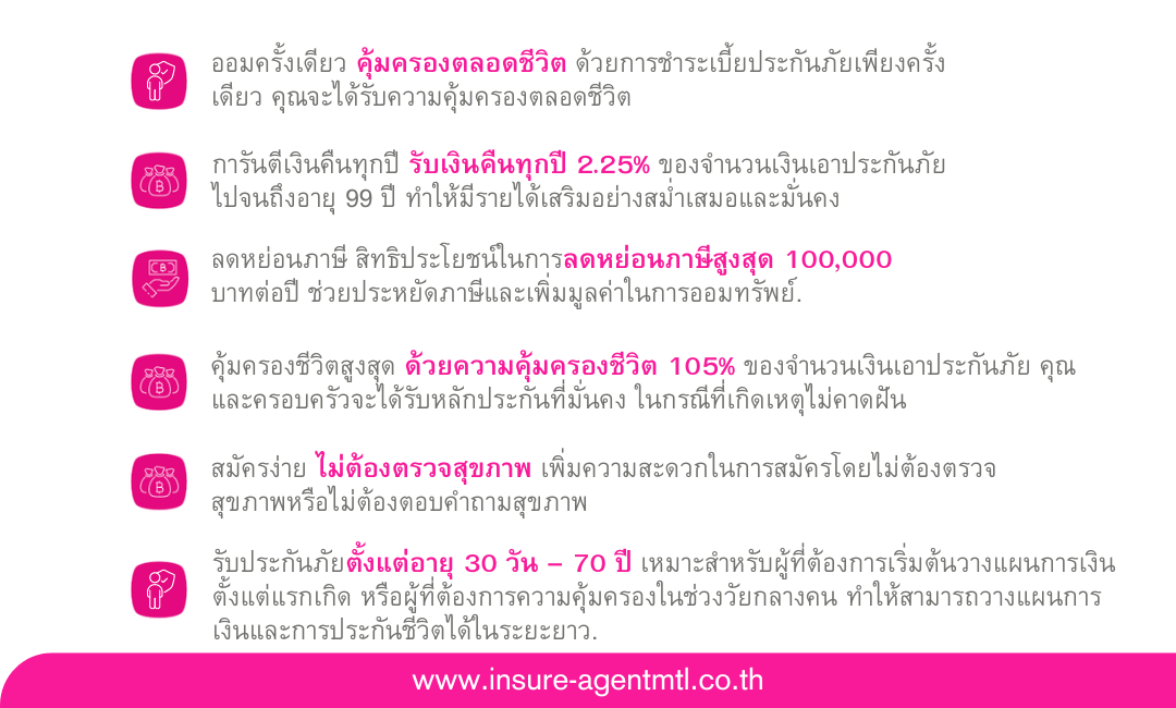 A2: จุดเด่นของโครงการนี้ได้แก่ การชำระเบี้ยประกันภัยเพียงครั้งเดียว มีเงินคืนทุกปี 2.25% ของจำนวนเงินเอาประกันภัย คุ้มครองชีวิต 105% ของจำนวนเงินเอาประกันภัย ลดหย่อนภาษีได้สูงสุด 100,000 บาท และไม่ต้องตรวจสุขภาพหรือการตอบคำถามสุขภาพ.