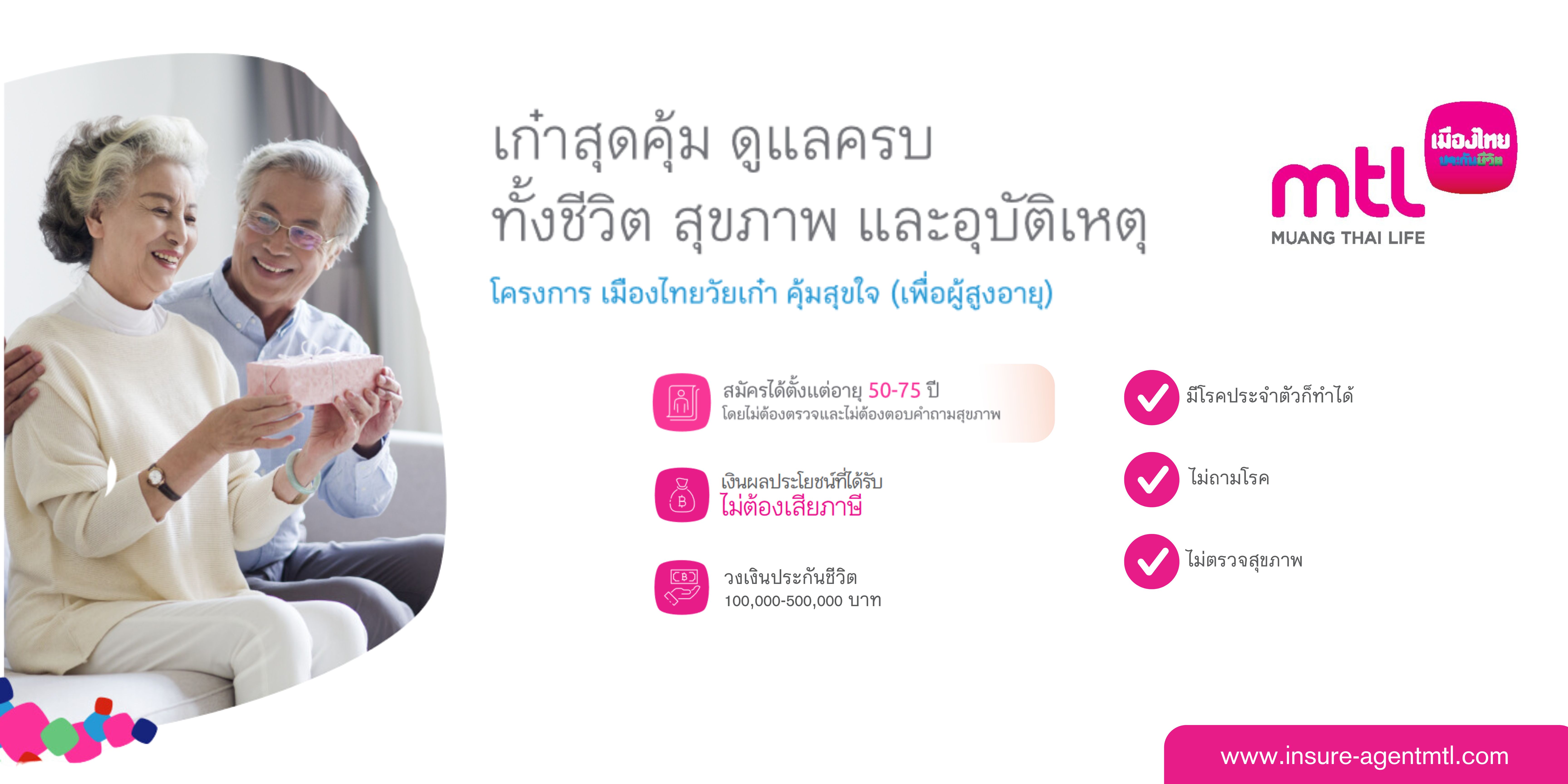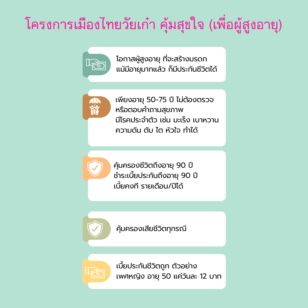 A1: โครงการเมืองไทยวัยเก๋า คุ้มสุขใจ เป็นประกันชีวิตสำหรับผู้สูงอายุที่มีโรคประจำตัว โดยมุ่งเน้นให้ความคุ้มครองและรับมือกับความท้าทายของชีวิตในหมู่ผู้สูงอายุ