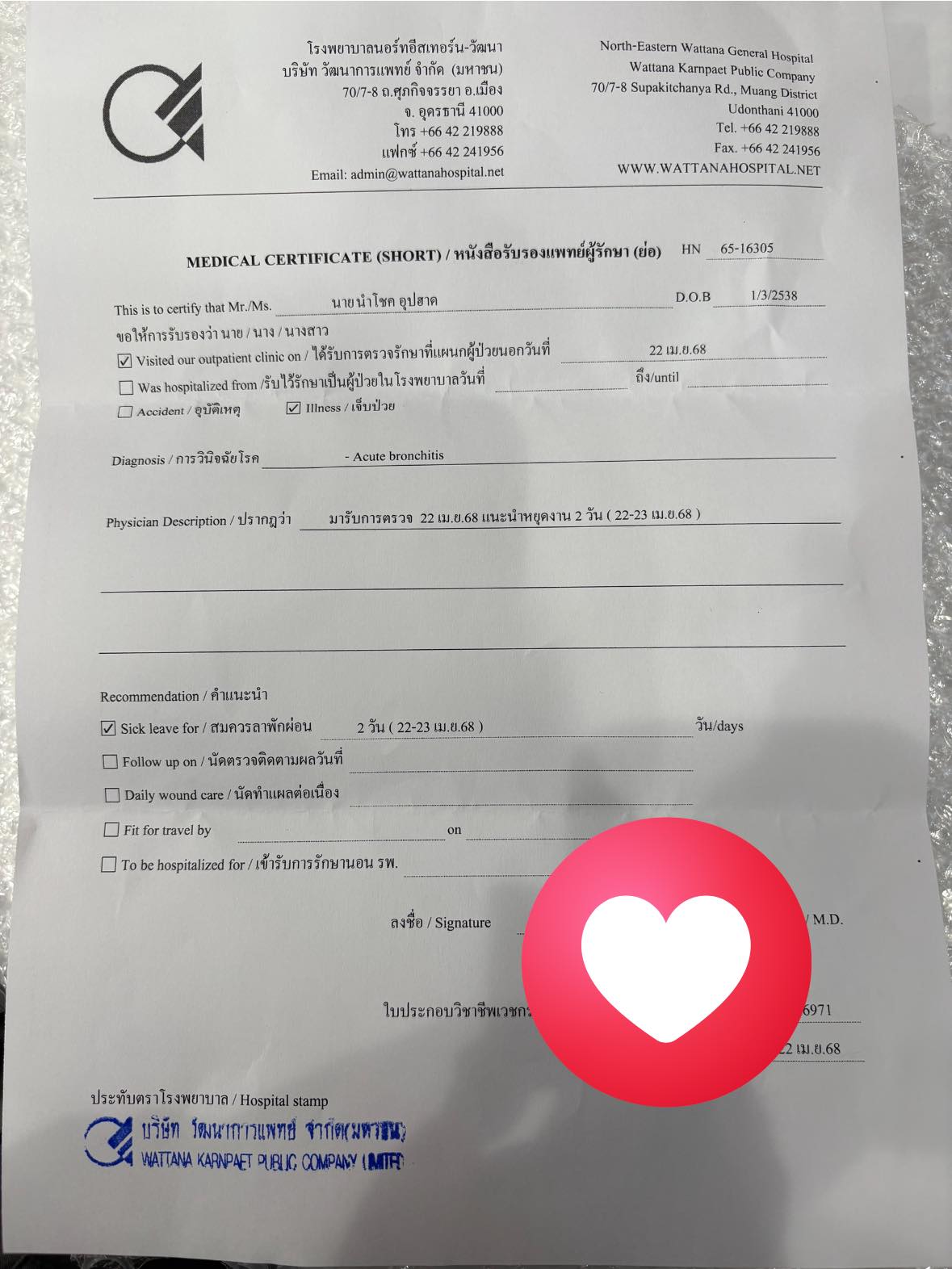 ตัดสินใจไปหาหมอนอกเวลาที่โรงพยาบาลวัฒนาอุดร โดยใช้สิทธิประกันสุขภาพ OPD ได้รับยาปฏิชีวนะ ยาแก้ไอ ยาแก้แพ้ และยาแก้ปวดลดอักเสบ พร้อมใบรับรองแพทย์ให้ลาป่วย 1 วัน แต่หลังจากนั้น อาการไอก็ยังไม่ดีขึ้น กลับแย่ลงเรื่อยๆ ร่างกายอ่อนไหวมาก เคลื่อนไหวหรือพูดนิดเดียวก็ไอ กินก็ไอ นอนก็ไอ ไอจนเหนื่อยและนอนไม่หลับเลย