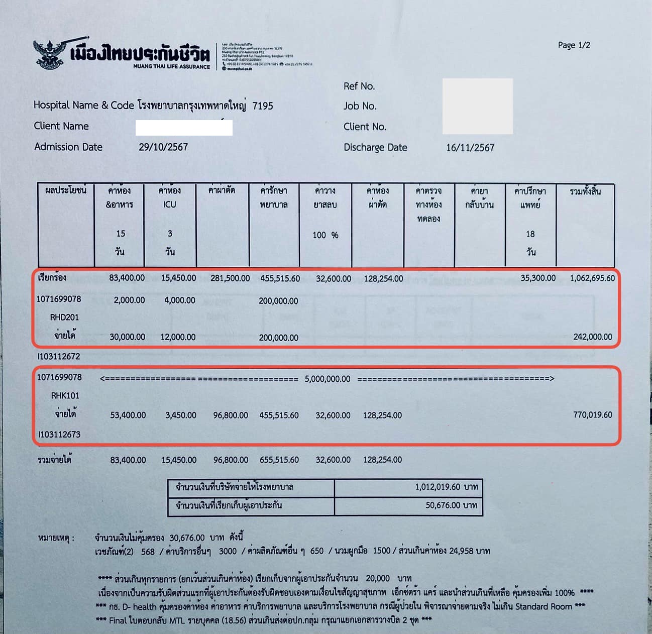 สรุป การรักษาตัวครั้งนี้ นอน รพ รวม 19 วัน ค่าใช้จ่ายรวม 1,062,695.60 บาท