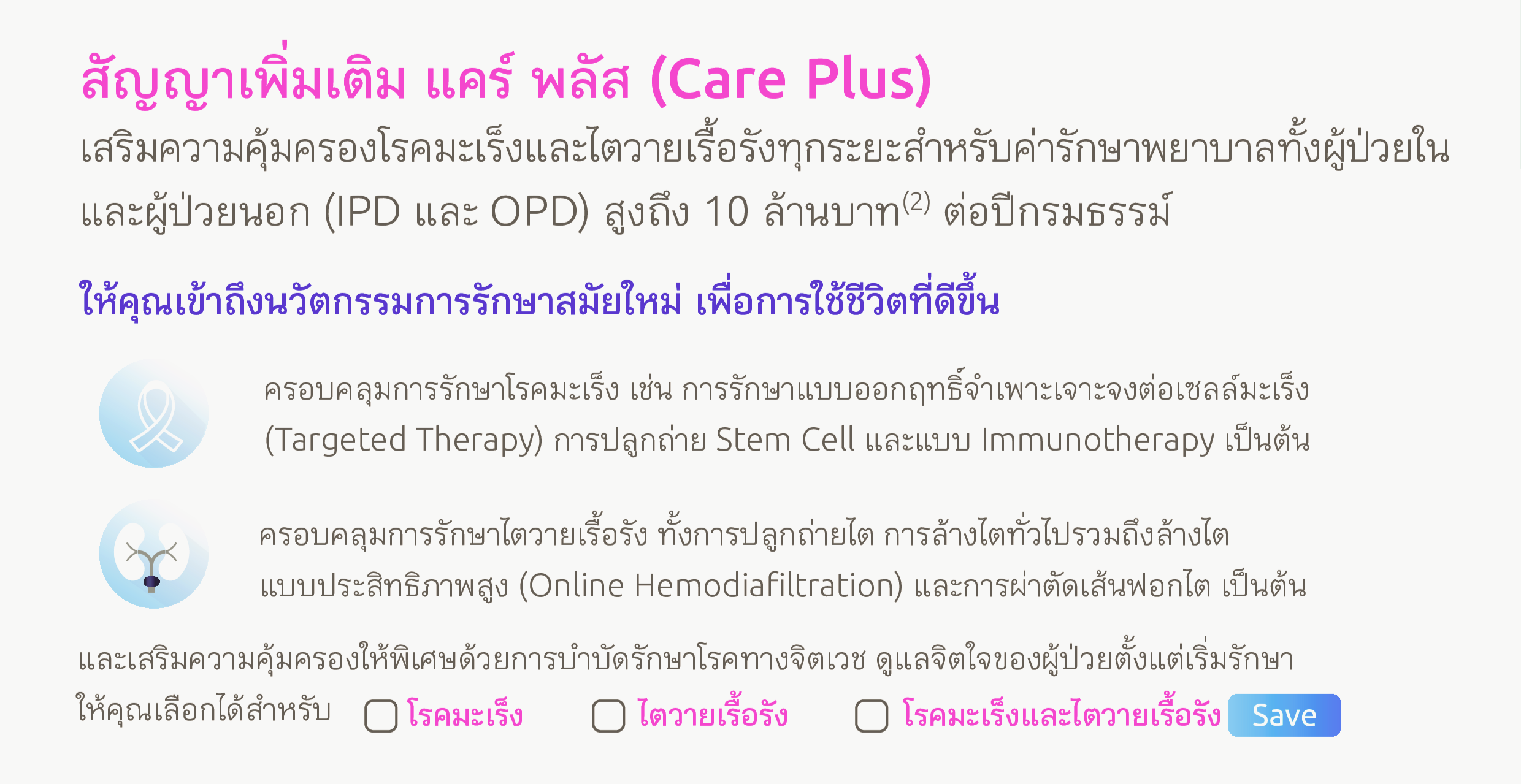 และความคุ้มครองสุขภาพ ดี เฮลท์ พลัส (D Health Plus) จะดูแลให้ 70,000 บาท ทั้งนี้จะจ่ายไม่เกินวงเงินความคุ้มครองตามที่ลูกค้าเลือก