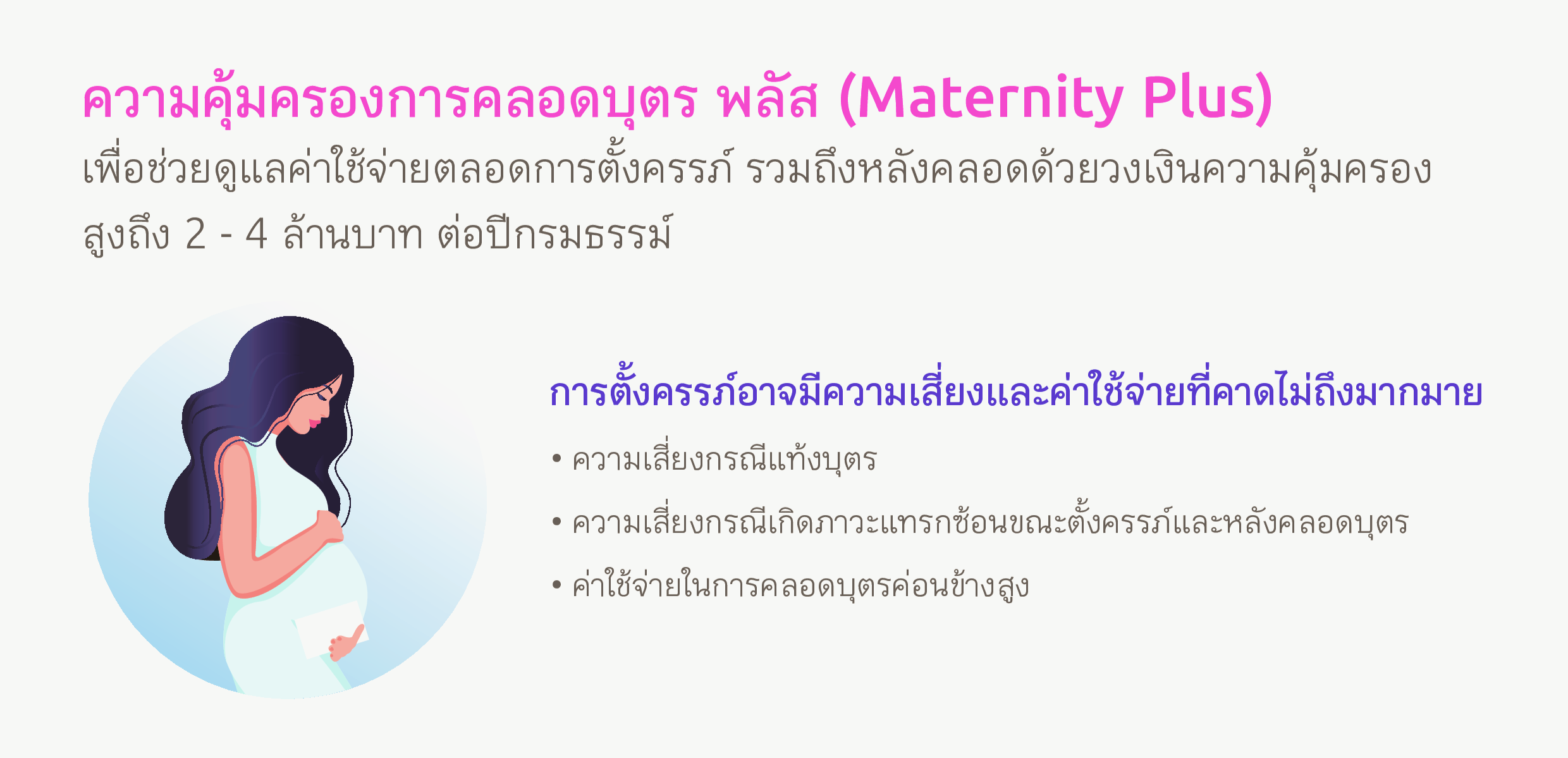 ตัวอย่างพลัสความคุ้มครองกรณีการตั้งครรภ์ เพราะค่าใช้จ่ายในการคลอดบุตรค่อนข้างสูงและอาจมีความเสี่ยงที่คาดไม่ถึง
