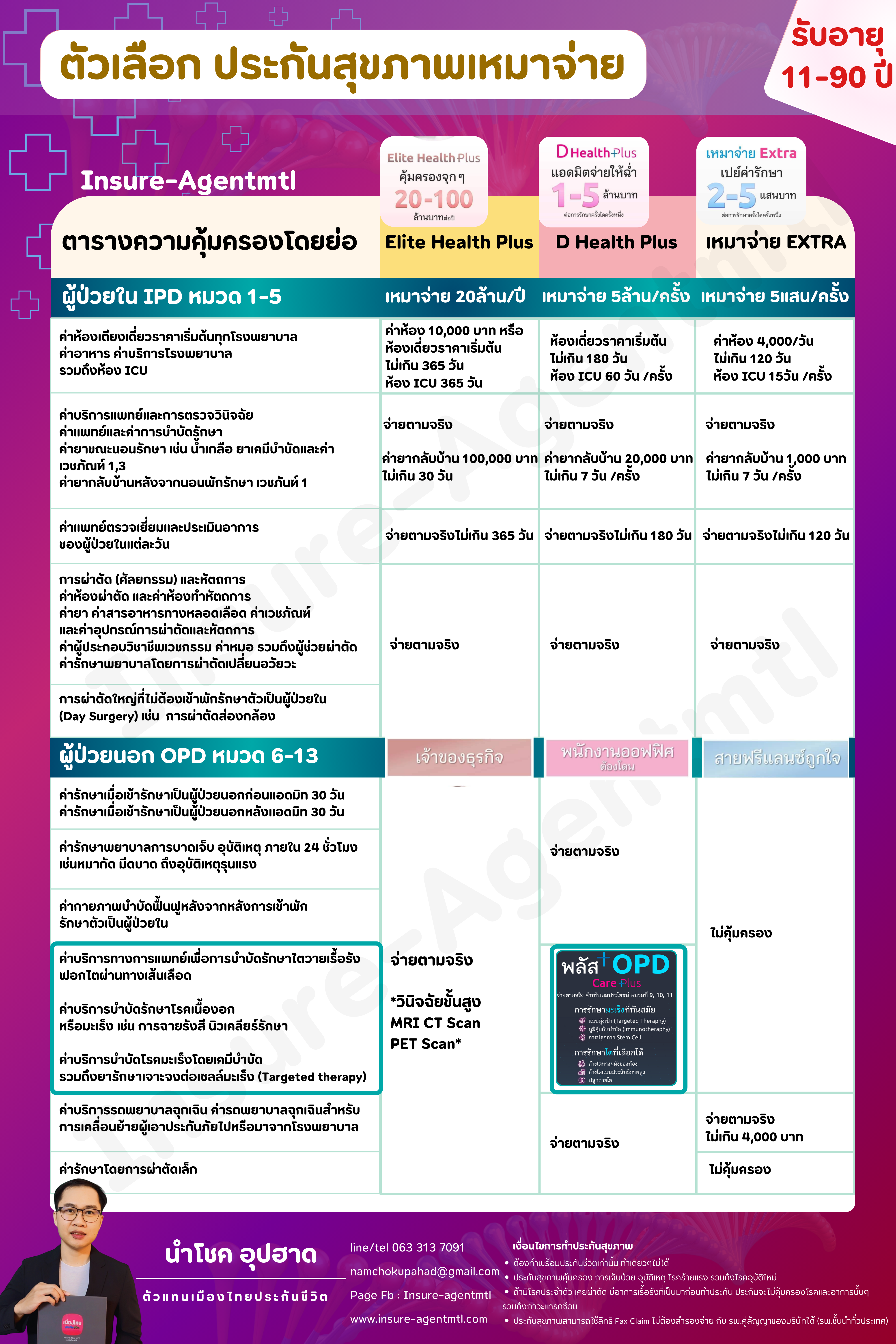 ค่าหมอ ค่ายา ค่าตรวจ ค่าผ่าตัด ค่ากายภาพบำบัด อีกทั้งจะผ่าตัดเล็กหรือใหญ่หรือบาดเจ็บจากอุบัติเหตุภายใน 24 ชั่วโมงโดยไม่ต้องนอนก็คุ้มครอง แบบเหมาจ่ายตามจริง